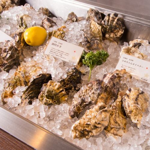 店内には牡蠣のショーケースがございます。常備5種類以上の取り揃えております。オイスタープラッター 3種 1,500円~