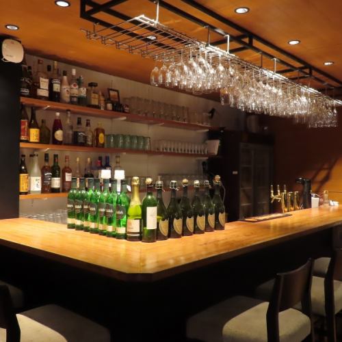 ワイングラスホルダーが圧巻な店内中央のカウンター席。本格的なバーカウンターは雰囲気たっぷり。